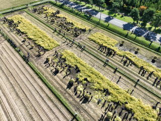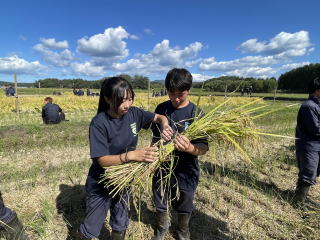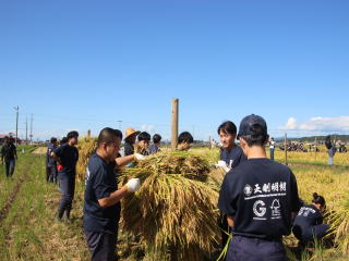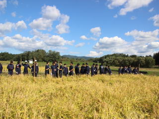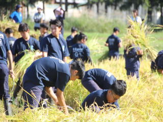 9月22日に本校水田で全校稲刈り競技会が開催されました。春の全校田植え競技会で生徒が植えた苗を収穫・結束・棒掛けしていきます。生徒は慣れない手つきで収穫・結束・棒掛けを行いました。