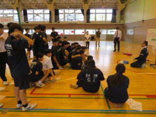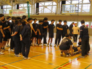 10月10日第一体育館で1学年を対象にAED講習会を行いました。AEDによる心肺蘇生法のあと、毛布を使った傷病者の移送方法、正しい担架の使い方を受講しました。