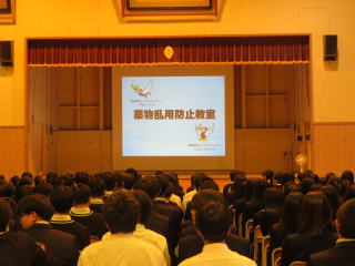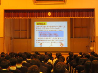 10月24日、第一体育館で薬物乱用防止教室が開催されました。青森県警察本部 生活安全部の浅井久美子 氏と青森県教育委員会 学校教育課の斗沢慎一郎 氏から薬物使用の恐ろしさや薬物乱用の未然防止について講演いただきました。