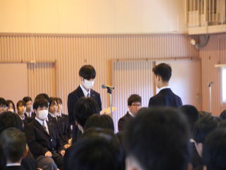 4月8日、本校第一体育館で対面式を実施しました。在校生代表として生徒会長の新木駿ノ介君が歓迎の言葉を、新入生代表として環境科学科の村井蒼空君が挨拶を行いました。